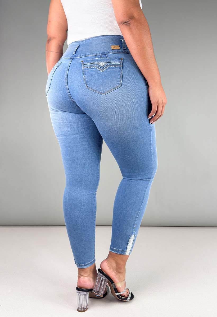 Resalta tus curvas con el curvy skinny referencia 95339, diseñado en un refrescante tono azul claro. Estos jeans mujer de tiro alto ofrecen un fit latino impecable, complementado con exclusivos detalles de pedrería y bordados sutiles en la parte frontal de las piernas que añaden un toque femenino y brillante. La prenda cuenta con bolsillos funcionales, un ajuste seguro de 3 botones y cierre con cremallera en denim de alta calidad. Es una pieza de moda colombiana diseñada para mujeres que quieren destacar con un estilo sensual y sofisticado. Disponible en tallas desde la 14 a la 20.